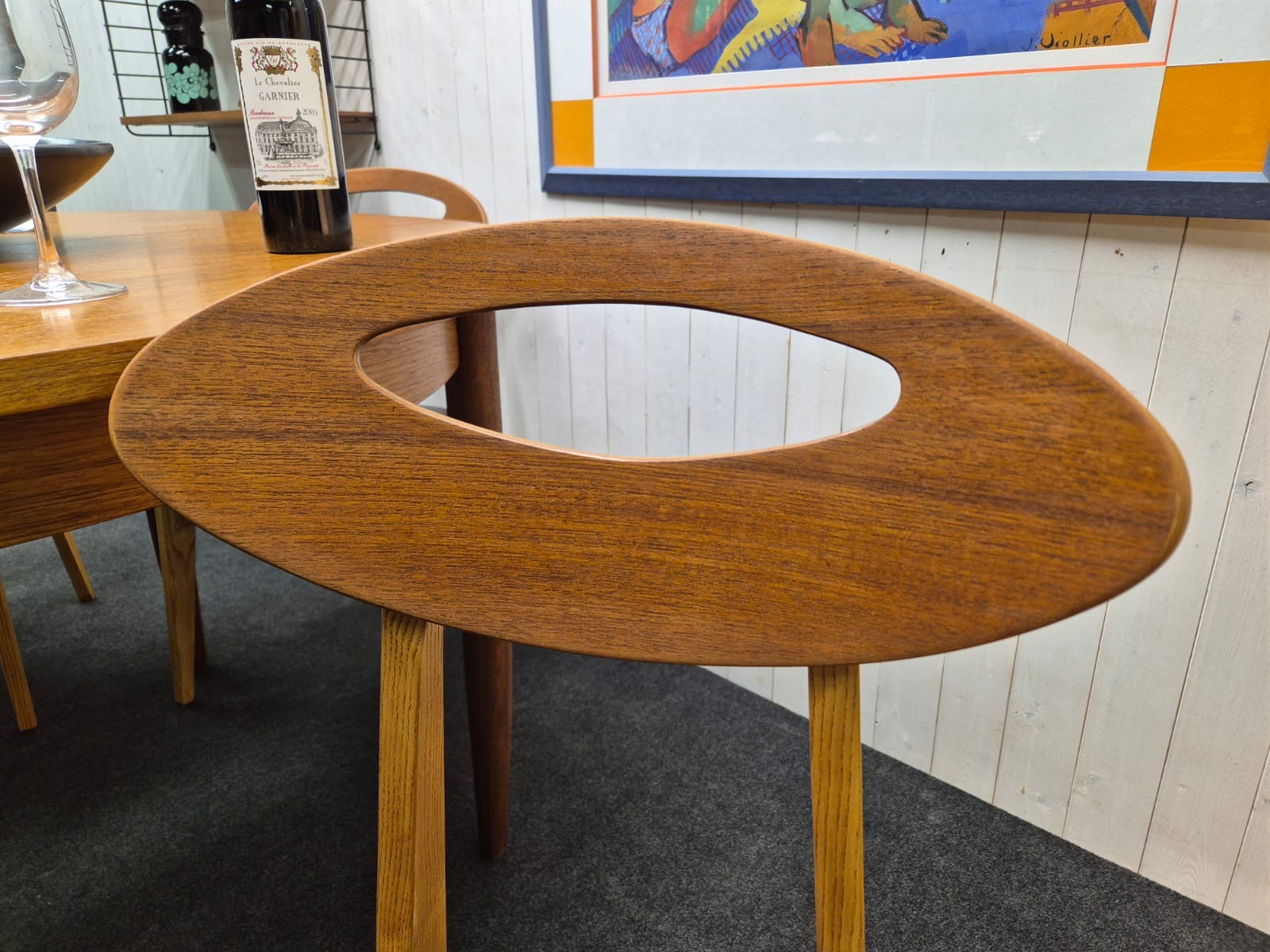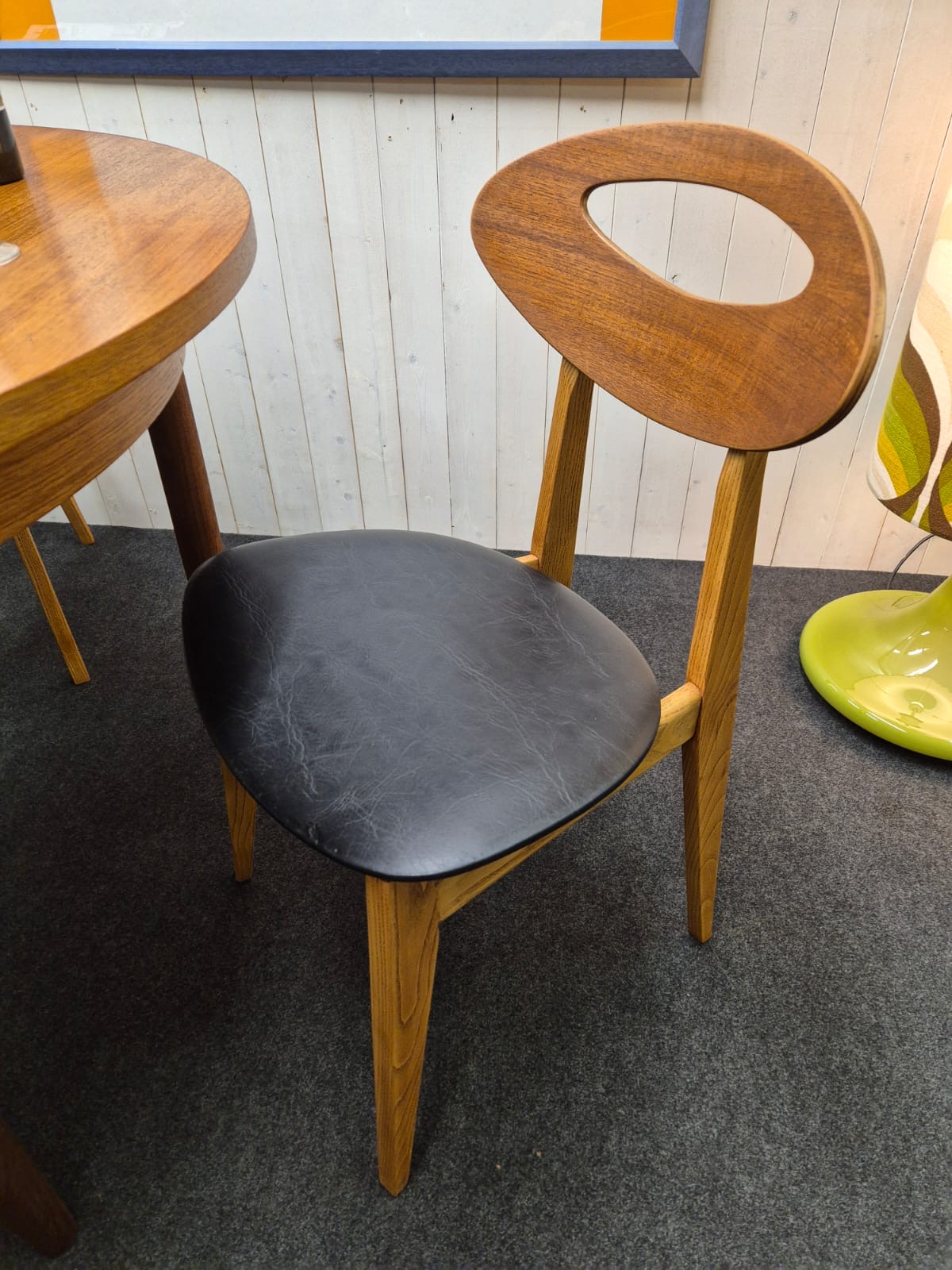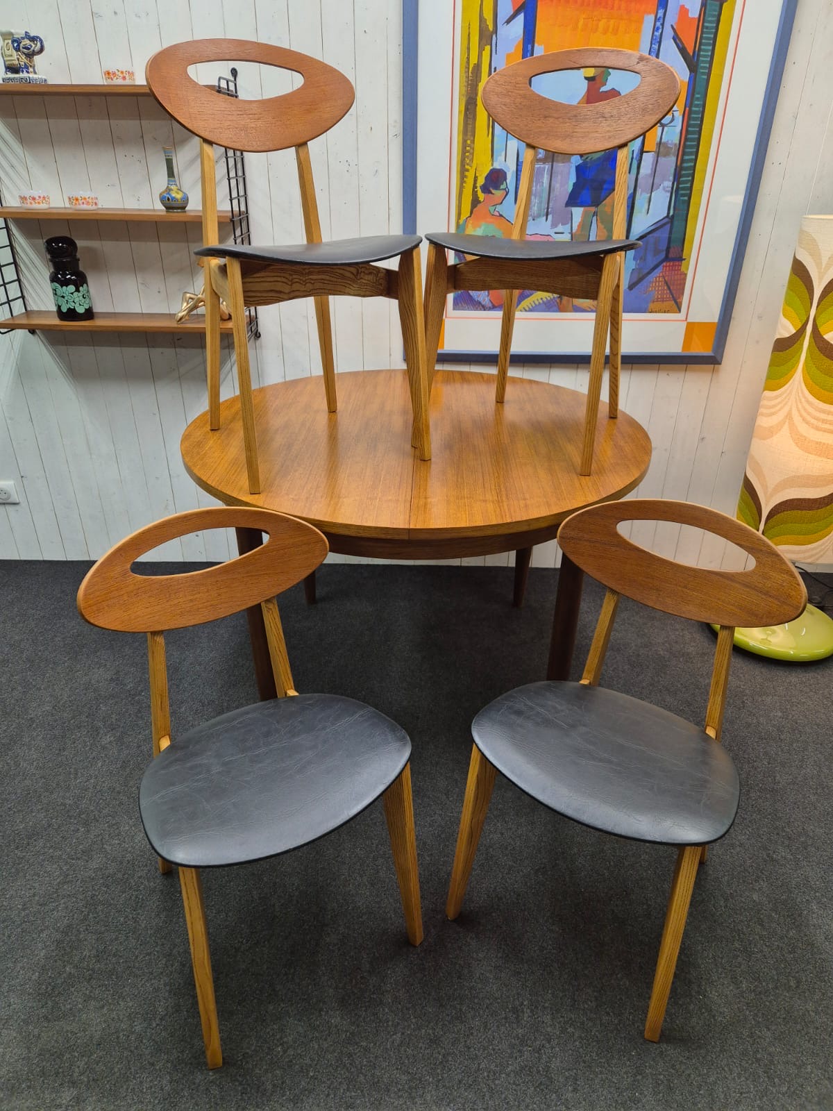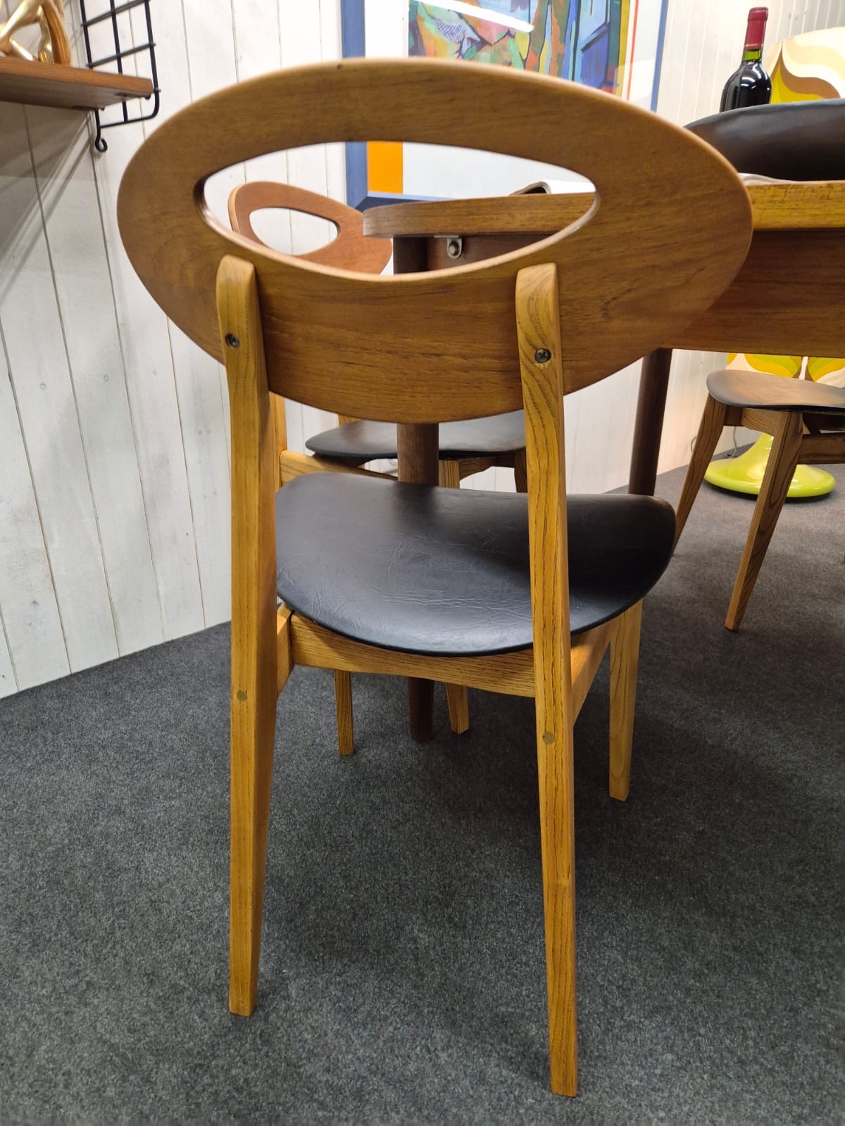 Série de 4 chaises vintage par Roger Landault. Les chaises sont en bon état, stables, et aussi confortables que belles. Le skaï des assises est d'origine, quelques accrocs discrets sont à noter.