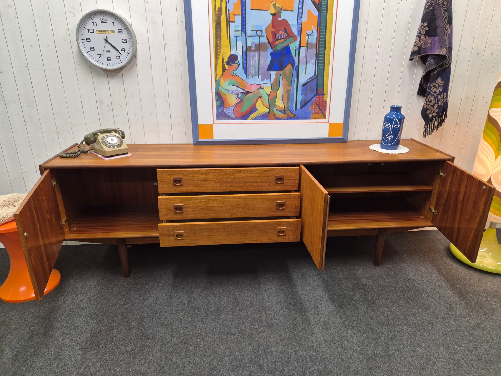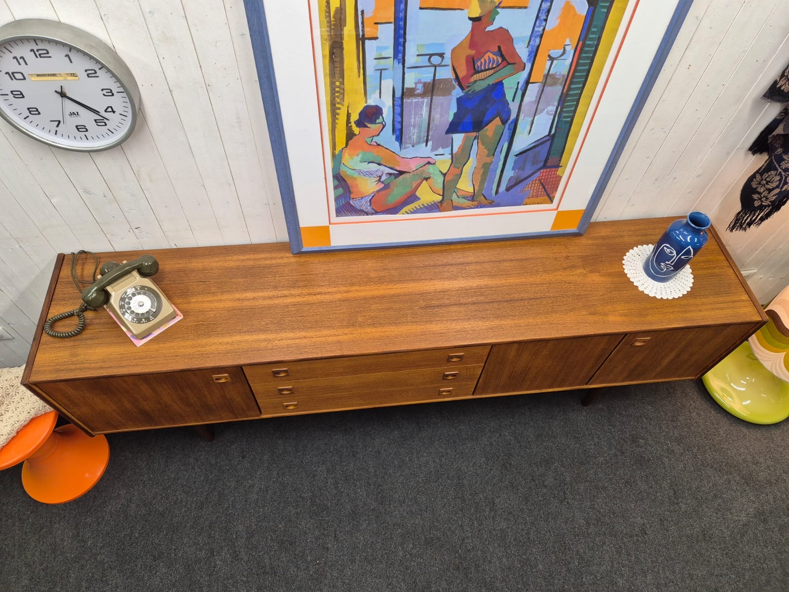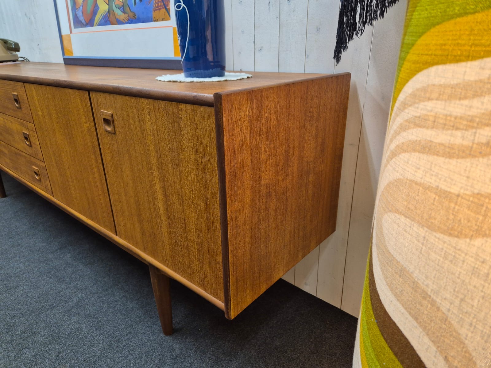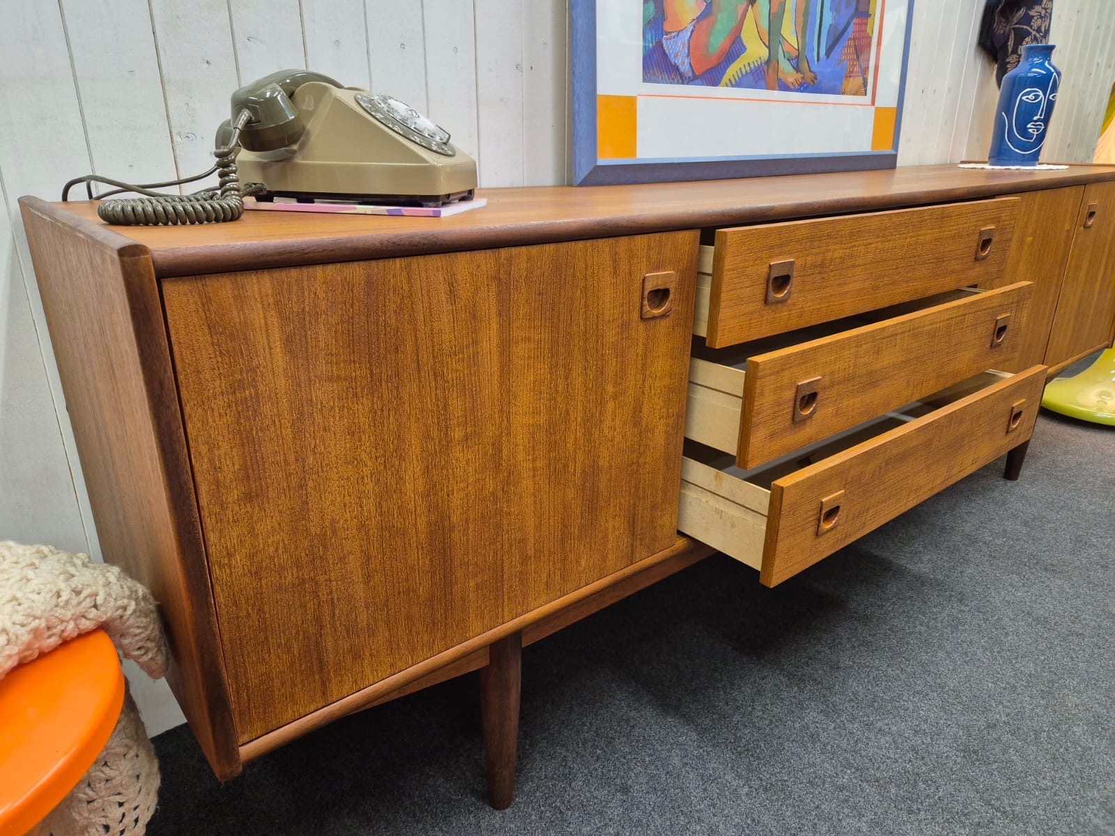 Enfilade en très bon état général, elle dispose d'une double porte battante avec grande étagère, 3 tiroirs ainsi que d'une porte battante simple de l'autre côté.