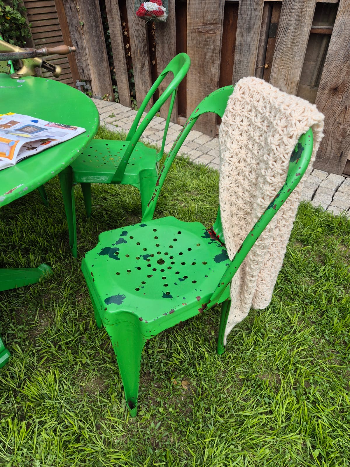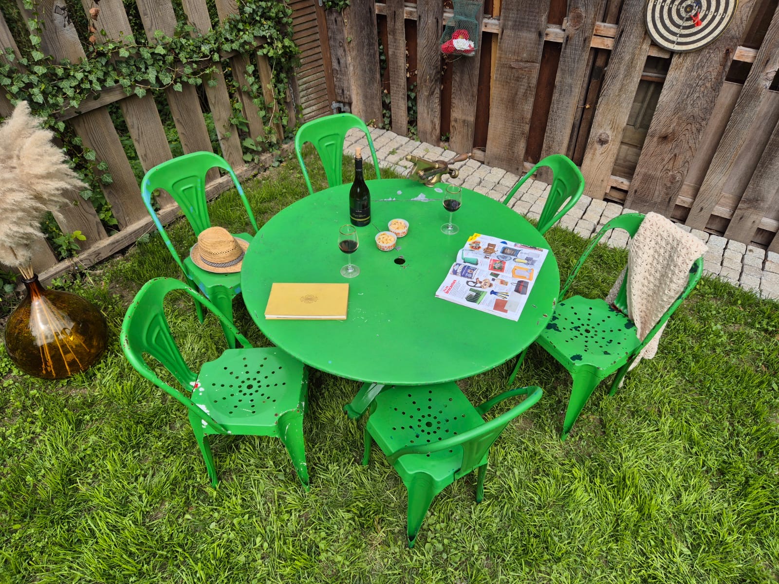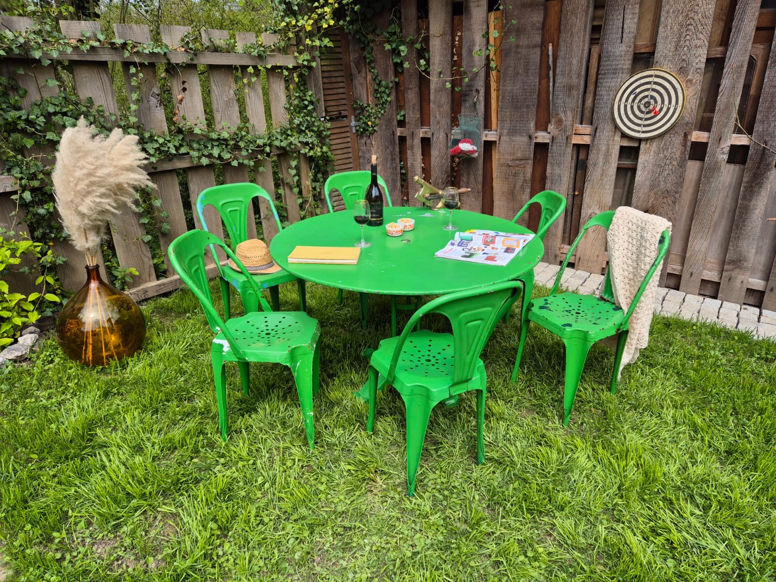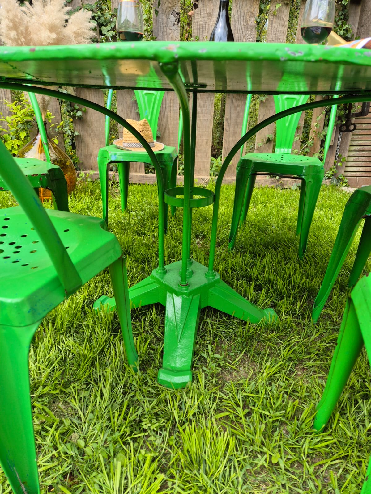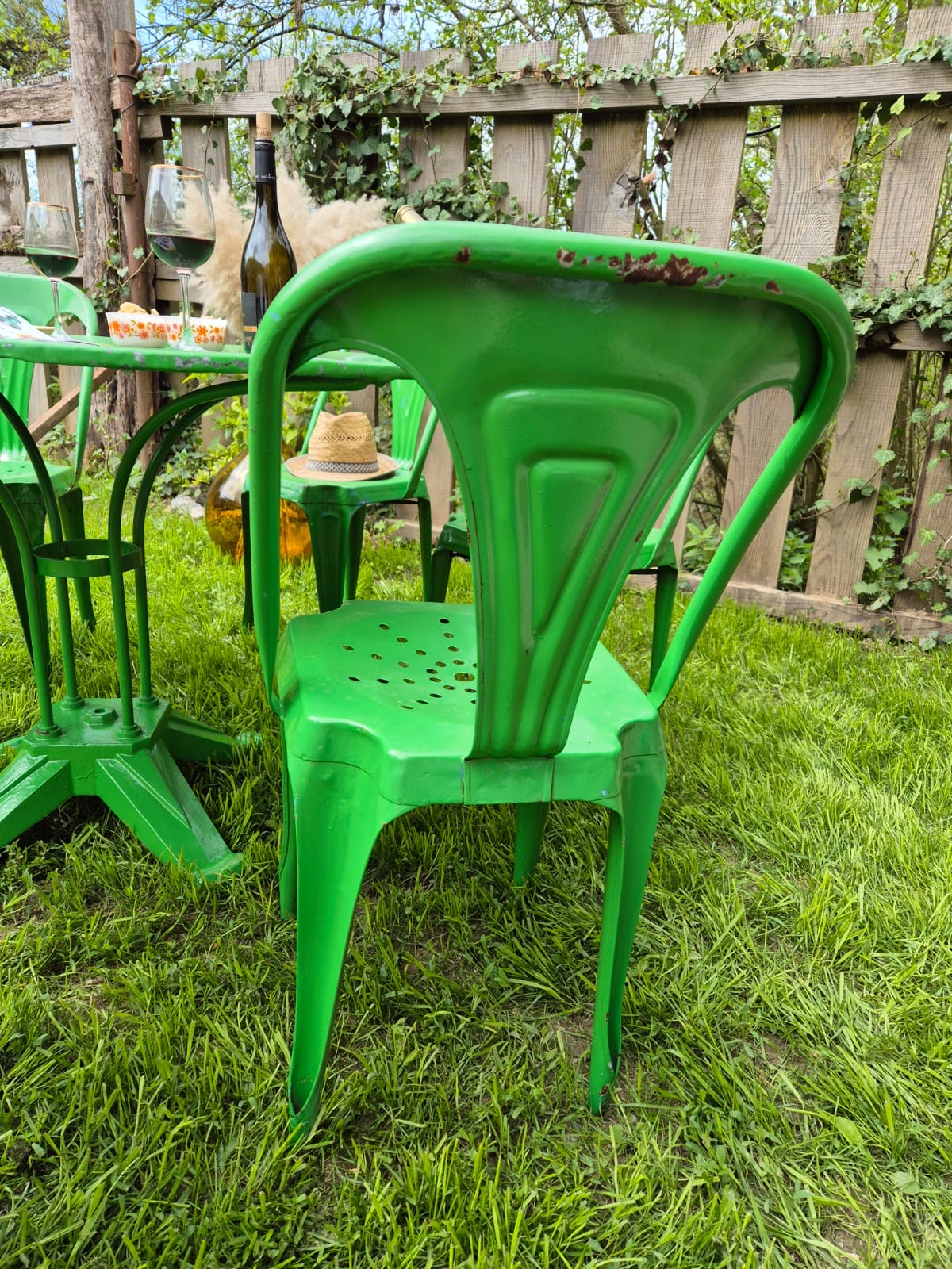 Ensemble de jardin composé d'une table style art déco en parfait état ainsi que de 6 chaises Joseph Mathieu (1950).
