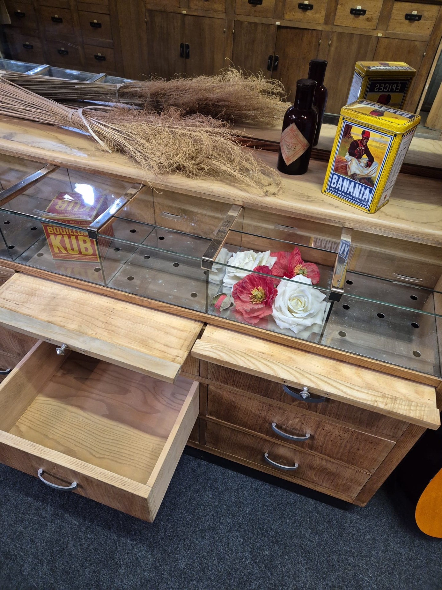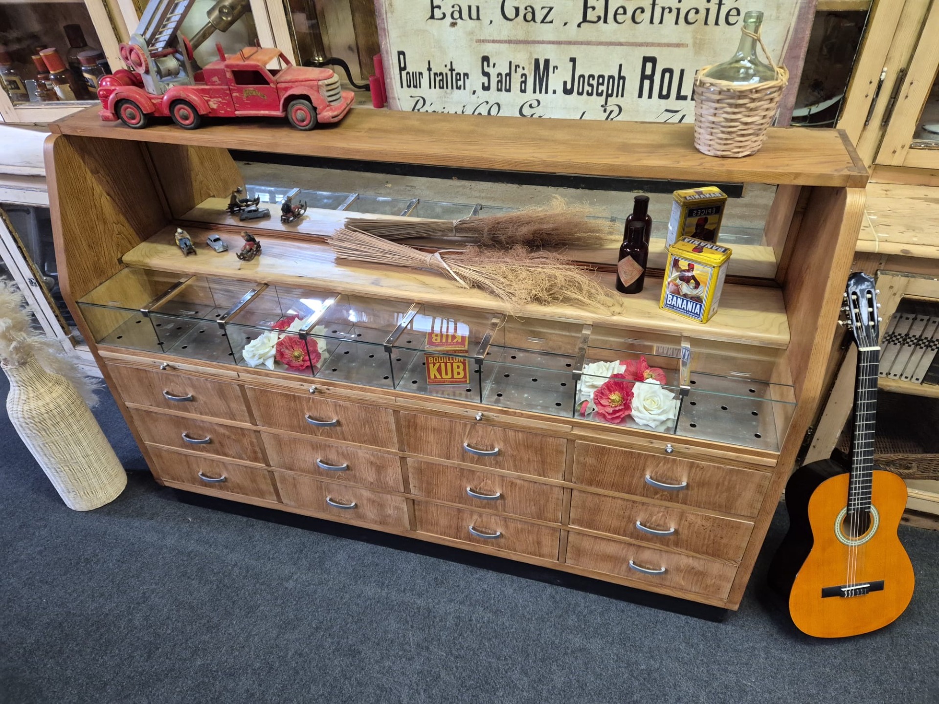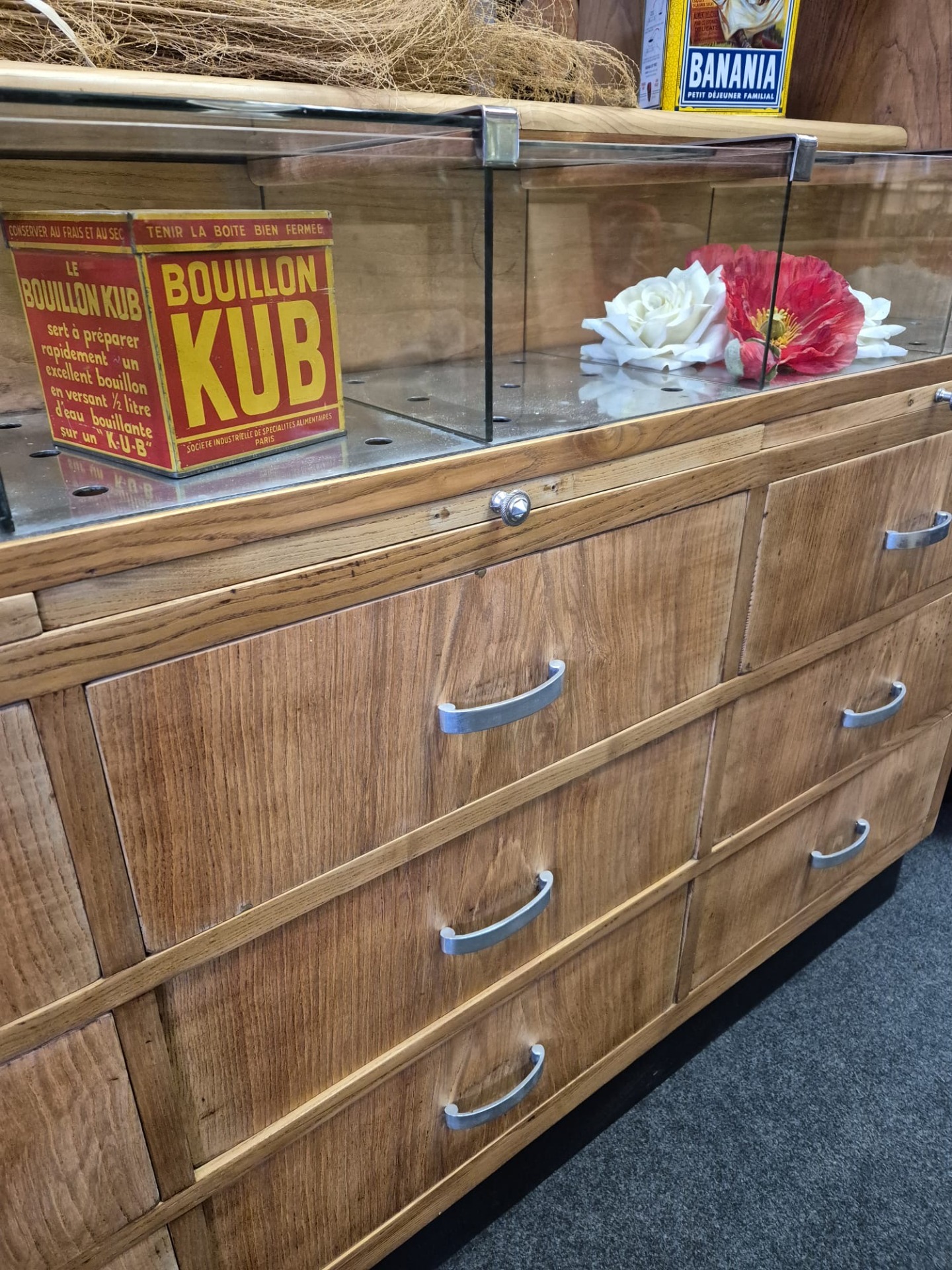 Meuble de boulangerie entièrement restauré. Très déco avec ses présentoirs à bonbons et son miroir au mercrure. il dispose également de 12 grands tiroirs et de 4 tablettes. L'ensemble du meuble est vernis.